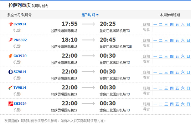 以上就是拉薩飛重慶的航班時(shí)刻表,起飛時(shí)間,到達(dá)時(shí)間,及固定航班日期。